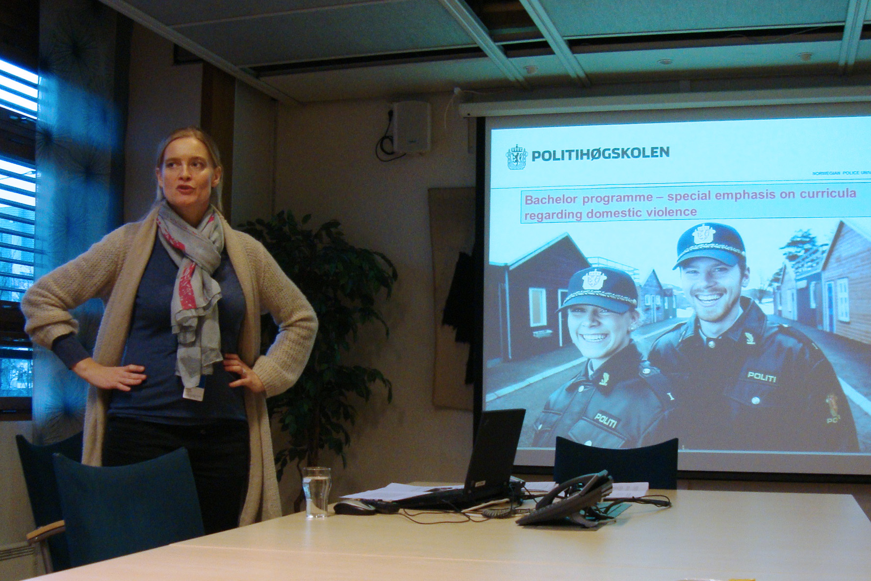 Kirsti Helene Messel, Senior Adviser at the International Unit of the Norwegian Police University College, explains how combating domestic violence is taught to law enforcers in Norway to a visiting group of Ukrainian experts.
